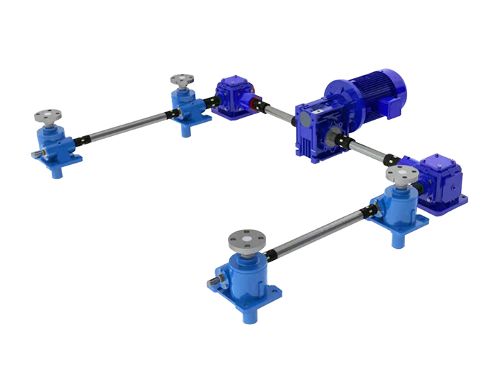 多臺聯(lián)動絲桿升降機平臺,電機在中間,電機連接轉(zhuǎn)向箱或者K系列減速機,在通過連接桿和···